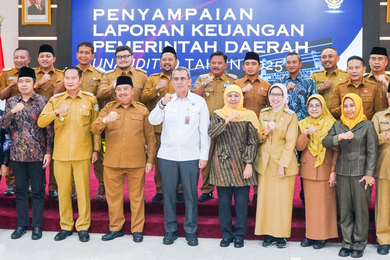 Gubernur Jatim Khofifah Indar Parawansa menyerahkan Laporan Keuangan Pemerintah Daerah (LKPD) Unaudited Tahun Anggaran 2025 kepada BPK RI Perwakilan Jawa Timur bersama 36 kabupaten/kota se-Jatim.
